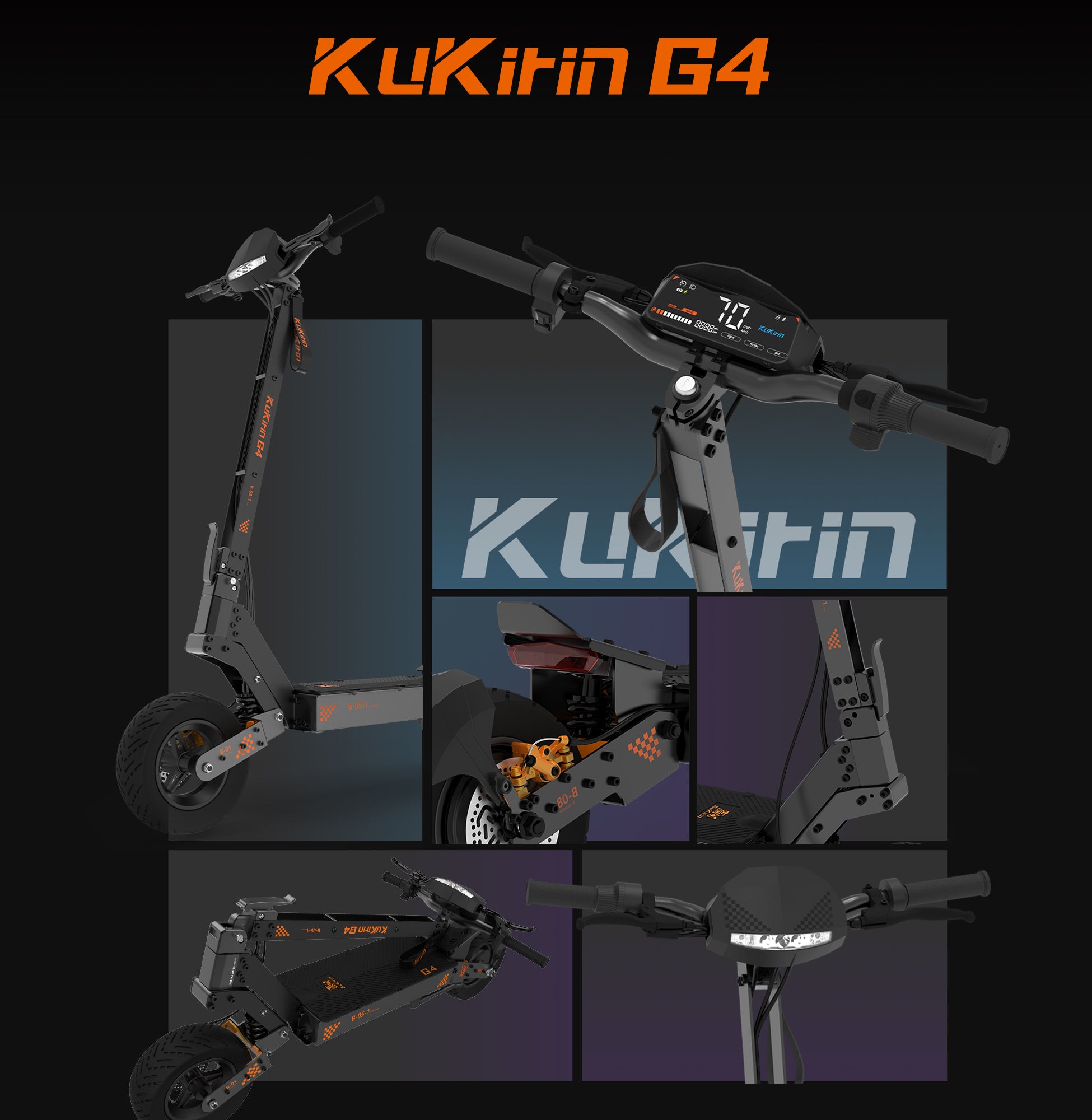 Trottinette électrique KuKirin G4 — moteur 2000W, vitesse 70 km/h, autonomie 75 km. Suspension avancée, roues 11 pouces.